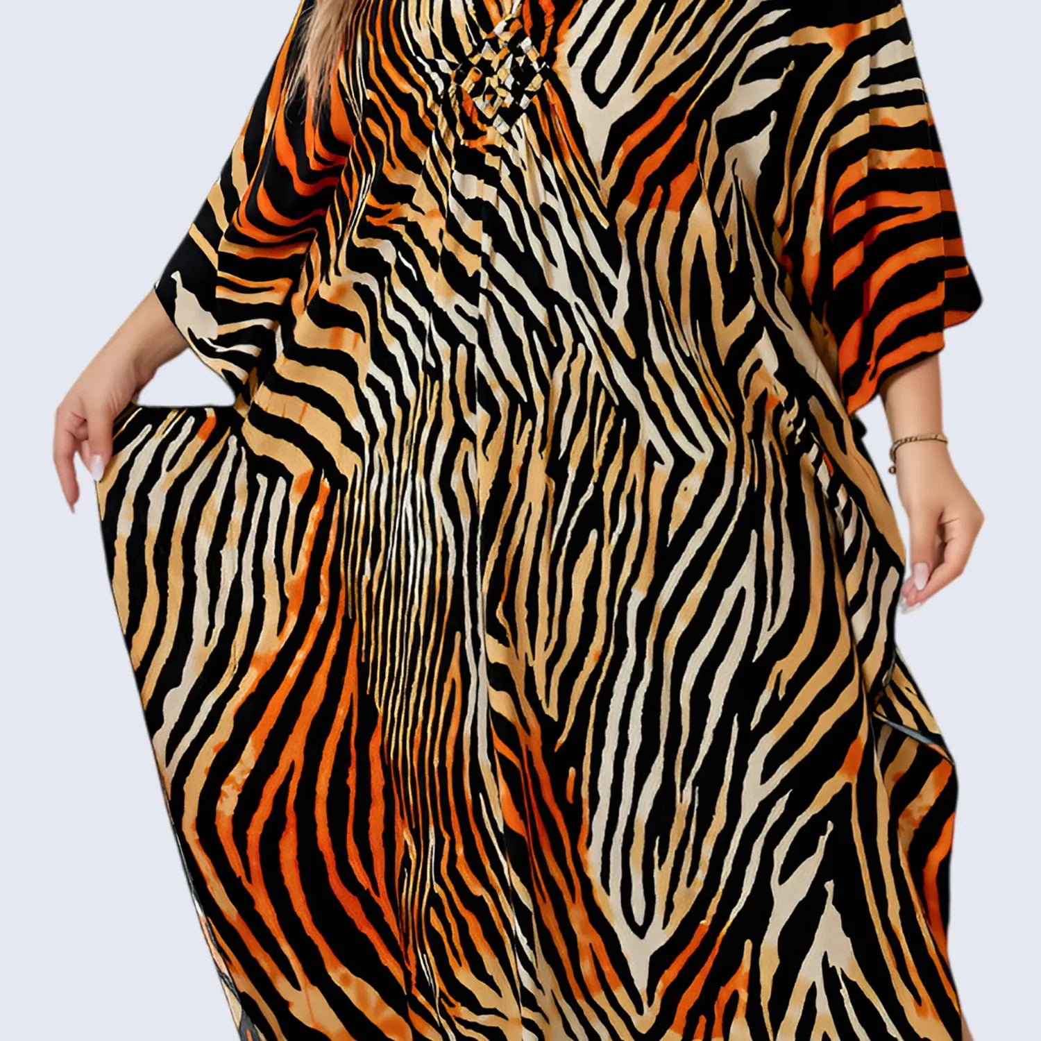 Stay effortlessly stylish with this orange abstract kaftan dress, made from a soft cotton blend for breathable comfort. Featuring batwing sleeves, and a flattering braided V-neck, it's perfect for beach vacations, resort wear, or lounging in style.